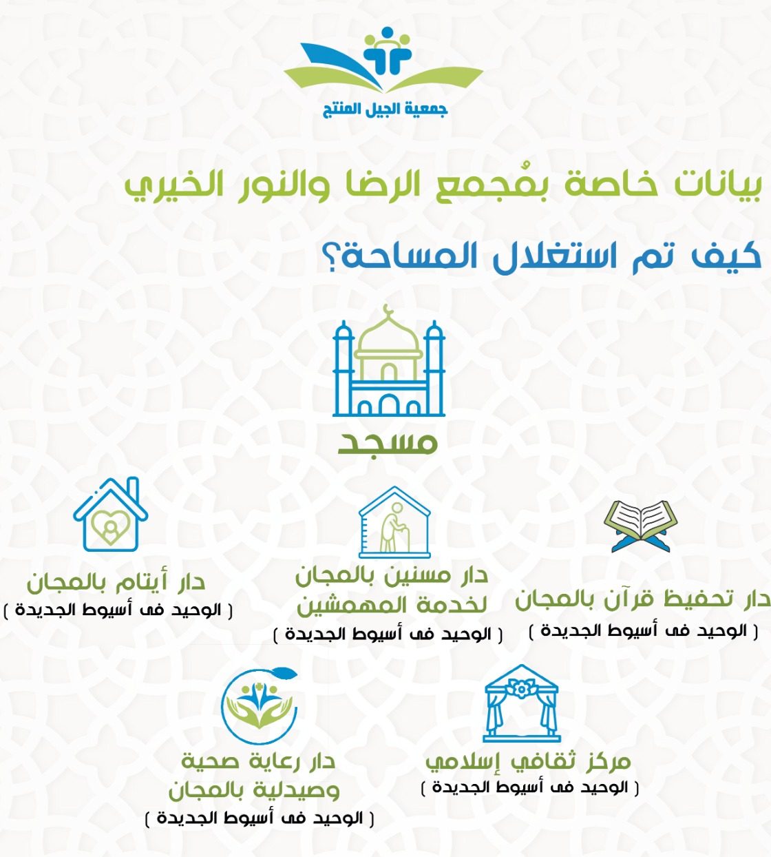 من فضل الله تعالى تم تخصيص قطعة الأرض رقم (19) لجمعية الجيل المنتج بمدينة أسيوط الجديدة باجمالى مساحة ( 10000) متر لبناء اكبر مسجد بالمدينة وتقع الارض بوسط مدينة اسيوط الجديده وذلك لاقامة بيت جديد بين بيوت الله مبتغيين فيه مرضاة الله والأجر والثواب وأن يجعل الله لنا ولكم ثواب كل ذكر سيقام فيه ، صدقة جارية عن (الأحياء - الاموات)